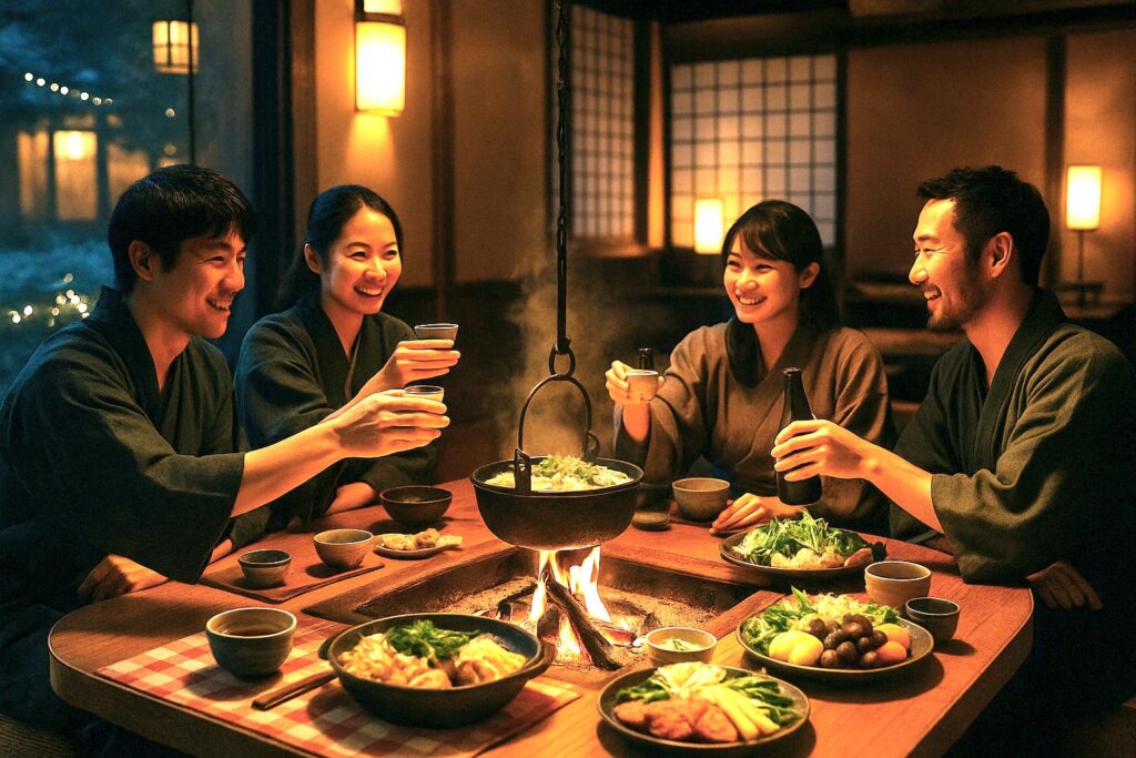 温泉宿では地元の旬食材を使った鍋料理やほかほかのおにぎりを用意しており、身体の内部から温かさが広がる幸せを味わえます。囲炉裏を囲んで談笑しながら、地元の酒やお茶で乾杯すれば、心もぽかぽかに。夜空に舞う雪を見上げると、冬の儚さと豊かさを改めて実感します。